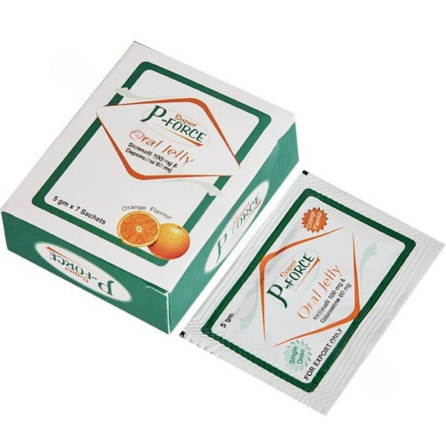 Super P Force oral jelly is an effective medication to treat erectile dysfunction (impotence in men) and premature ejaculation. Super P Force contains the active salts of Sildenafil Citrate and Dapoxetine Hydrochloride. The pack, containing seven sachets, offers flavorful solutions for oral consumption. Super P Force is a proven treatment option to treat erectile dysfunction (ED) and premature ejaculation (PE).